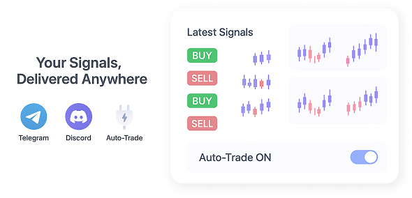 Trade Signals are your real-time prompts generated from your chosen strategies inside Charts Connect. These signals can be sent directly to your Telegram, Discord or integrated for auto-trading execution. Each signal comes with clear direction, entry logic and suggested risk levels so you can act fast with confidence. Whether you prefer manual confirmation or automated execution, our Trade Signals keep you in sync with the market without constantly monitoring charts. Designed for clarity and speed, these signals help remove guesswork and emotional hesitation, allowing you to follow a structured trading plan with consistency.